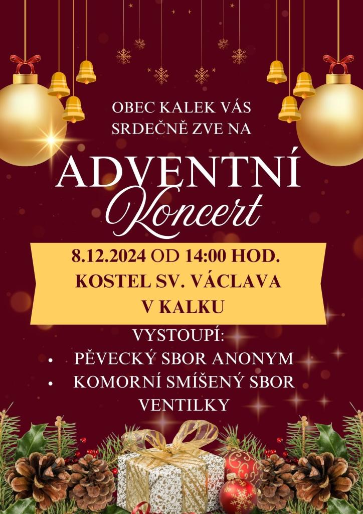 Obec Kalek Vás zve na Adventní koncert v neděli 8.12.2024 od 14 hodin do kostela sv. Václava v Kalku. Vystoupí pěvecký sbor ANONYM a komorní smíšený sbor VENTILKY. Občerstvení je zajištěno. Těšíme se na Vás.