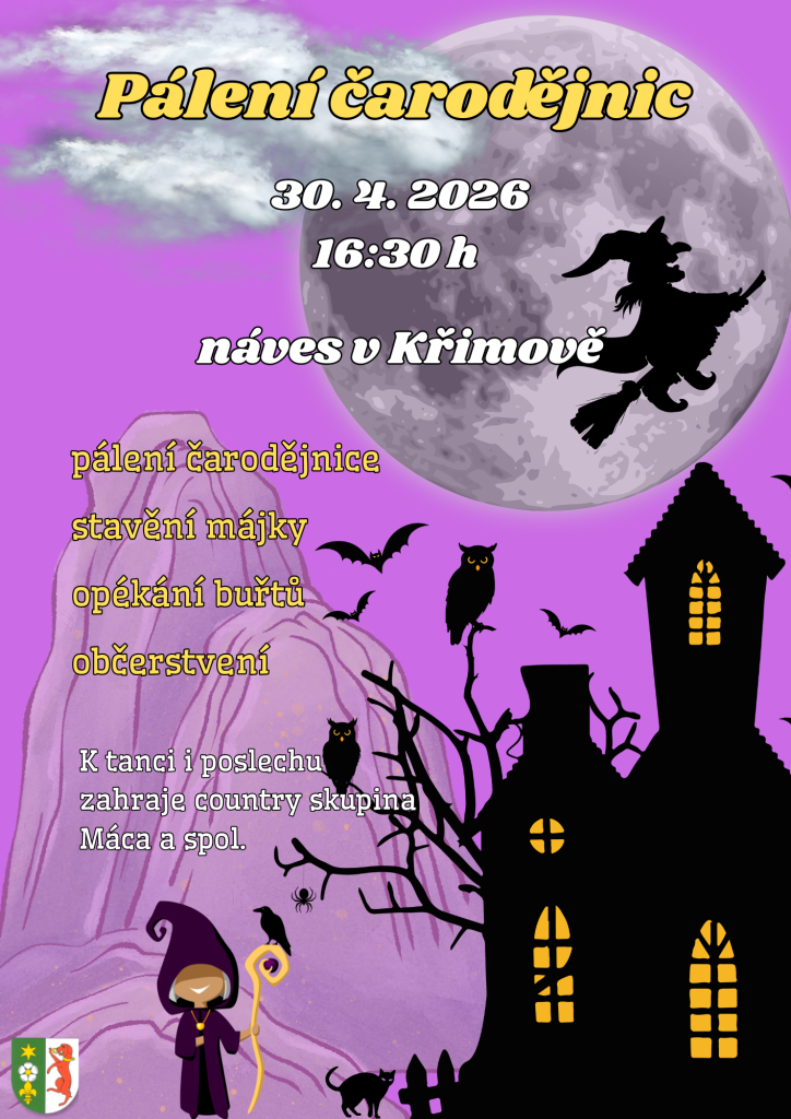 Přijďte si užít pálení čarodějnic do Křimova - na náves, kde se bude stavět májka, pálit čarodějnice, opékat buřty a k tanci i poslechu bude hrát country kapela Máca a spol. Těšíme se na vás.