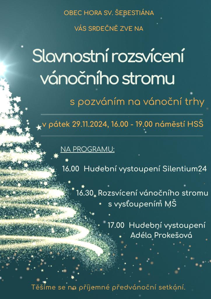 V pátek 29. listopadu 2024 se na náměstí HSŠ v Hoře sv. Šebestiána uskuteční slavnostní rozsvícení vánočního stromu. Program začne v 16:00 hudebním vystoupením Silentium24, následovat bude rozsvícení stromu v 16:30 s vystoupením MŠ. Od 17.00 zazní vánoční písničky v podání Adély Radimcové. Těšíme se na vaši účast a společné předvánoční setkání.